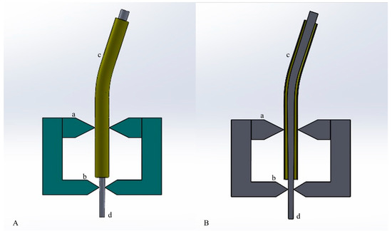 Schematic representation of the custom-made support apparatus simulating angulated access of NiTi instruments used in the static torsional test: (A) the support apparatus in its entirety, (B) its sectional view. (a) The upper part of the vise can fix the interchangeable artificial canal (20°-angled in figure); (b) the inferior part of the wise can firmly secure the instrument at 3 mm from its tip; (c) the artificial stainless-steel canal with predetermined curvature; (d) schematic representation of the NiTi instrument. The upper portion of the instrument is connected to the endodontic motor.