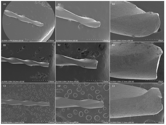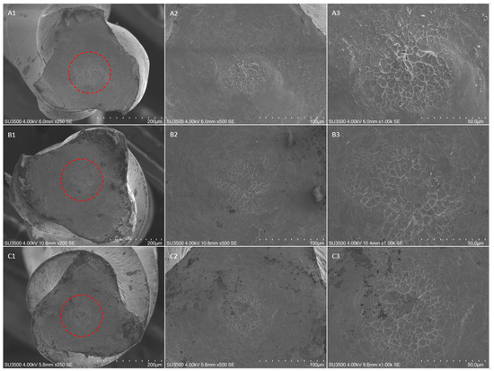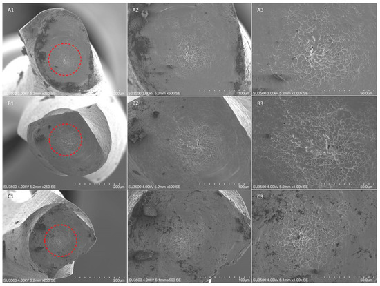 SEM images of fractured surface of three samples of F-One 25/04 in a transversal view at different magnification after torsional fatigue testing. Figures represent SEM images of instruments fractured after torsional test performed with a straight insertion in the artificial canal, respectively at 250×, 500× and 1000× magnification; (B1–B3) SEM images, respectively at 250×, 500× and 1000× magnification, after torsional test performed with an insertion angle of 10°; (C1–C3) SEM images, respectively at 250×, 500× and 1000× magnification, after torsional test performed with an insertion angle of 20°. The concentric circular abrasion marks and fibrous dimples near the center of rotation evidenced by the red circumferential lines are clearly represented in all samples despite the different angle of insertion.