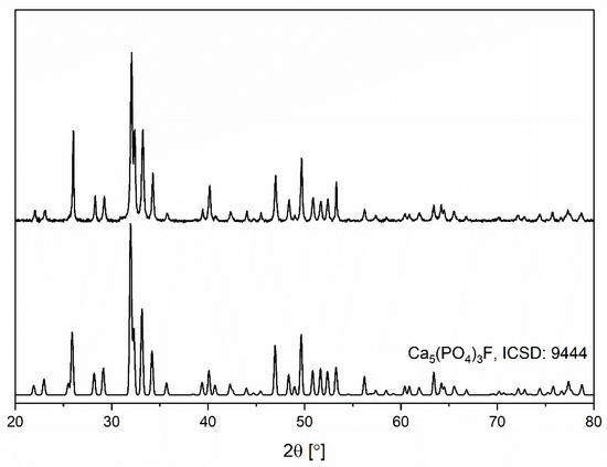 The pure crystal phase of the nanocrystalline fluorapatite was affirmed via X-ray powder diffraction measurement (Figure 1). Obtained diffractogram was juxtaposed with a standard pattern from Inorganic Crystal Structure Database (No. 9444). No additional crystal phases were observed. The relative intensities of the diffraction peaks differ from the standard pattern, which can be attributed to the crystallographic texture. The main difference in the relative intensities is observed for the (002) and (004) planes.