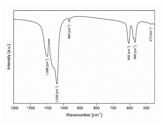 The Fourier transform infrared (FT-IR) spectrum was recorded covering the 400–1300 cm−1 spectral region at room temperature. Obtained spectrum consists of vibrations typical to the PO43− groups at 473 cm−1 (ν2), 568 cm−1 (ν4), 605 cm−1 (ν4), 965 cm−1 (ν1), 1039 cm−1 (ν3) and 1098 cm−1 (ν3) (Figure 3). The vibrational bands can be described as the non-degenerated stretching mode (ν1), and the triply degenerated asymmetric stretching mode (ν3) of P–O bonds. Additionally, observed vibrational bands are associated with the doubly degenerated (ν2) and the triply degenerated (ν4) bending modes of O–P–O bonds [39].