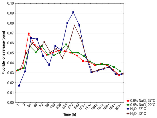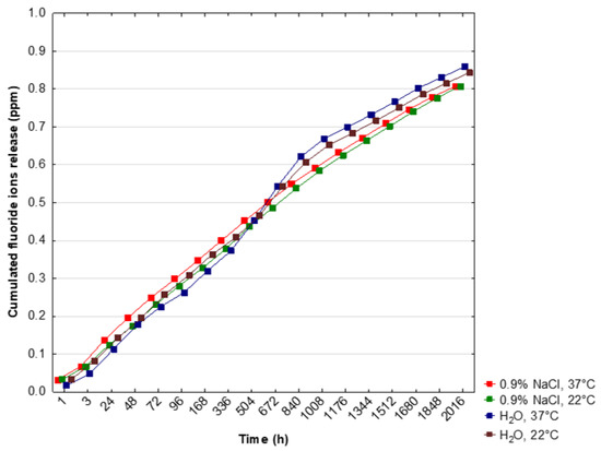 The cumulated concentration of F− ions was significantly higher after 1 h and 3 h of incubation in NaCl, 37 °C and NaCl, 22 °C, and H2O, 22 °C than in H2O, 37 °C (p < 0.05) (Table 2). After 672 h (4 weeks) and 840 h (5 weeks), the release of fluoride ions significantly increased in H2O, 37 °C and H2O, 22 °C (p < 0.05) (Table 2). Finally, the highest cumulated level of F− ions was observed during incubation in deionized water and at 37 °C (Table 2, Figure 6).