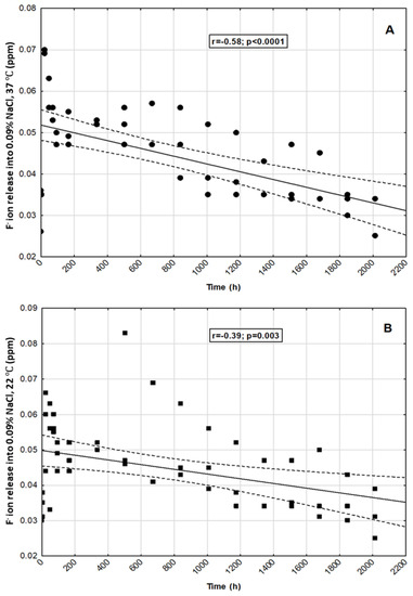 We observed statistically significant negative correlations between selected time points and fluoride ion release in all tested incubation conditions (p < 0.05) (Figure 5A–D).