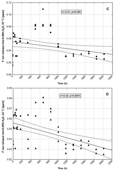 Correlation between selected time points and fluoride ion release into: (A)—0.9% NaCl, 37 °C; (B)—0.9% NaCl, 22 °C; (C)—H2O, 37 °C; (D)—H2O, 22 °C.