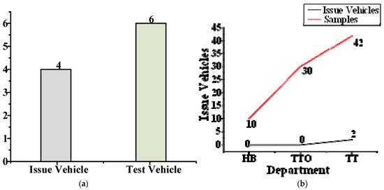 Vehicle survey map. (a) Statistical chart of problem vehicles; (b) number of problem vehicles by department. HB is Hard Tooled Functional Build. TTO is Tool Try-Out. TT is Tooling Trial. HB, TTO and TT are the three departments in automobile production.
