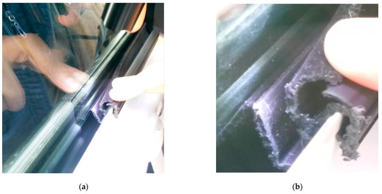 The windows of some automobiles will appear to squeak and rattle (S&R) when it goes down, although this only occurs in some automobile models. To solve the problem of S&R when the window goes down, a sample survey was carried out on the vehicles in each stage of production, as shown in Figure 1b. Four automobiles had window problems, as shown in Figure 1a. The front windows of three automobiles had the problem and only one automobile’s rear window had the problem.