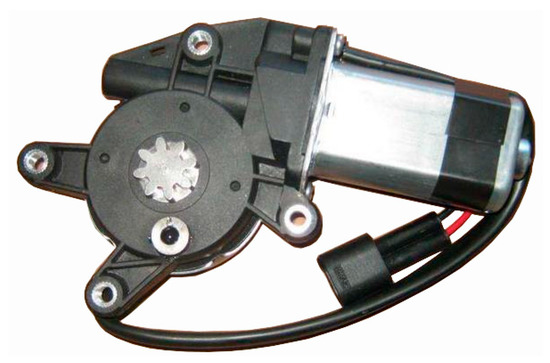 The lifter used for the door is an electric rope wheel lifter, which can generate rotary motion under the drag of the direct current motor. The rotary motion is transformed into low-speed linear motion (about 20 mm/s) through a worm and rope wheel to further drive the side window glass to lift. The structure of the electric motor and transmission mechanism is shown in Figure 7.