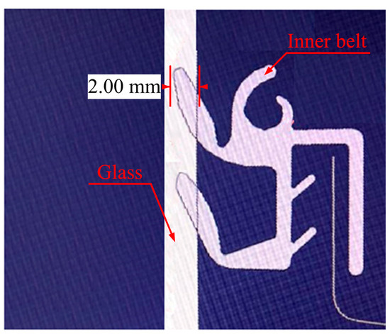 The motor drives the car side window glass to move up and down. Because there is a certain amount of interference between the car glass and the inner belt, which is about 2 mm, as shown in Figure 8, there is a certain CLD after the installation of the inner belt. Driven by the motor and transmission mechanism, the side window of the automobile is moved up and down to explore the source of the “rattle” sound when the side window of the car goes down. In the following chapters, an improved inner belt will be tested.