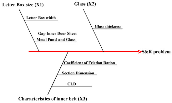 Determine ordinal and transverse coordinates according to the 6 Sigma analysis method. The Y-axis represents the noise when the window is lifting and lowering and the X-axis represents the factors influencing the noise, such as glass thickness, inner belt characteristics and letter box size, as shown in Figure 10.