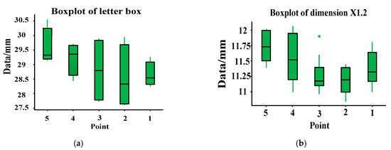 Then, the TT Department measured the data of 42 vehicles, and the dimensions of X1.1 and X1.2 were statistically analyzed with Minitab. Minitab is a software package for carrying out the functions of quality management, statistics and data analysis. The size statistics of X1.1 are presented in Figure 13a, and the size statistics of X1.2 are presented in Figure 13b. As can be seen from Figure 13a, the size of the window box tends to increase from point 1 to 5. It can be seen from Figure 13b that the size trend of X1.2 is basically consistent with that of X1.1.