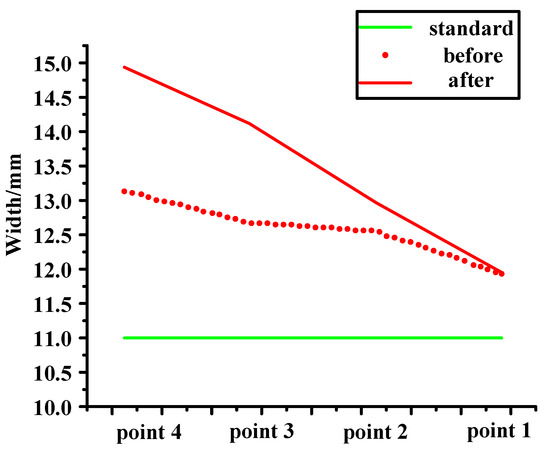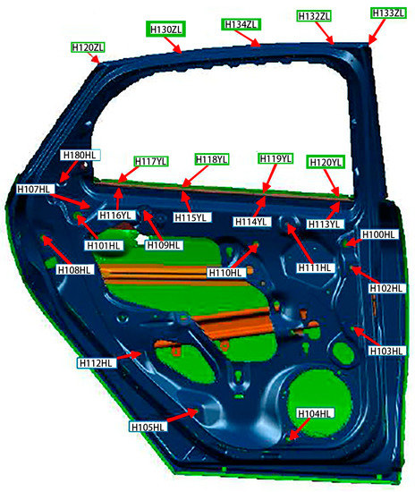 In the previous analysis, we found that the dimensions of X1.1 and X1.2 also have a certain impact on S&R, so we measured the dimensions of the automobile letter box, with the measuring points as shown in Figure 14. The size of X1.1 and X1.2 can be further improved to reduce rattle. The point position of the vehicle left front door was measured, and the data are recorded in Table 3. From the data in Table 3, it can be found that the size of the right door exceeds the limit. The number of testing points and the qualified rate are listed in Table 4.