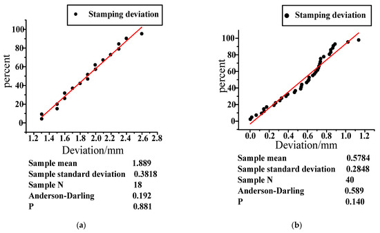 Deviation statistical chart of door position. (a) Dimension deviation diagram before improvement; (b) improved dimensional deviation diagram. The red line is a standard normal detection line, which is automatically generated by Minitab. The closer the black dot is to the red line, the more the data conforms to the normal distribution.