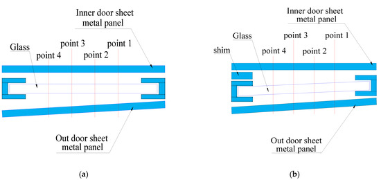 The position of the vehicle glass is changed, that is to say, the size of X1.2 is changed. The position before the change is shown in Figure 16a. As shown in Figure 15, a 1.4 mm washer is added to the inside of the window glass, so that the size of X1.2 will change. The size of X1.2 before and after the change is presented in Figure 17. It can be seen from the figure that the closer the point is to the shim, the greater the decreasing trend of X1.2. It is found that the noise can be reduced by reducing the distance of X1.2, but the rattle noise still exists. Therefore, X1 is not the key factor in noise generation. In other words, improving X1 to reduce the effect of rattle noise is not obvious. To reduce the S&R, we need to further explore other factors.
