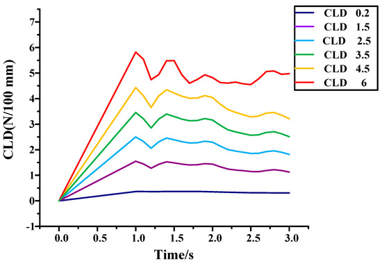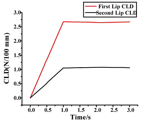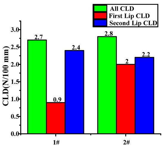 Because the first lip of the inner belt has two points of support (Figure 21a), the second lip has only one point of support, which has poor stability and low structural stiffness. Therefore, the second lip is simulated separately under different CLD. The results are shown in Figure 29.