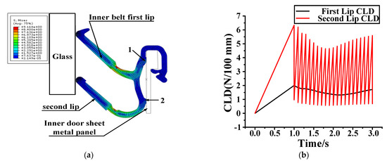Compared with the inner belt, the hardness and stiffness of the glass and the inner door sheet metal are larger, so the glass and the inner door sheet metal are set as analytical rigid bodies. There are 28 grids in each area where the inner belt rubs against the glass. The part far away from the glass is sparse, and the total number of cells in the grid is 1627. The inner door sheet metal is fixed, and the inner door metal plate and the inner belt fit together at points 1 and 2. For the need of function, there is a certain preload between the inner belt and the glass, the glass drops at a certain speed (20 mm/s), and the friction coefficient between the glass and the inner belt is 0.4. The glass, inner belt and inner door metal plate are assembled according to their actual size. The movement of the glass when it descends is simulated, and the load on the first and second lips of the inner belt is analyzed, and is reported in Figure 21. The total process lasts for three seconds. The first second is the loading process of the inner belt load. Figure 21a shows the pressure load at the end of the first second. The second and third seconds are the descending process of the internal water shear window glass. In this process, the inner belt rubs against the window glass. The generated friction load is recorded in Figure 21b, from which the pressure change when the glass and the inner belt rub together can be clearly seen. The CLD of the first lip of the inner belt is relatively small, and the change is relatively stable. However, the CLD of the second lip of the inner belt is relatively large, and the change of the load is very unstable in the process of the glass falling, resulting in a serrated load change diagram, which shows that there is a stick–slip effect between the inner belt and the glass. This is the cause of the S&R.