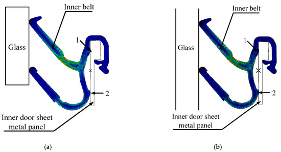 The first step is to preload the inner belt load. A depiction of the pressure load following preloading is shown in Figure 25a. Because of the improvement of the inner belt structure, the CLD of the 2nd lip becomes smaller after the inner belt is preloaded. The second step is the process of the glass moving downward, the falling speed is 20 mm/s, the simulation time of the falling process is 2 s, and the pressure load following this is shown in Figure 25b. Since rattle noise is caused by the collision between the second lip of the inner belt and the glass, Figure 26 shows the change of the CLD between the inner belt and the glass. On the basis of the numerical simulation, it is found that reducing the CLD of the second lip and the friction coefficient of the inner belt lip can effectively eliminate the rattle noise and completely solve the problem of rattle. The method for reducing the CLD of the second lip is to increase the height of the second lip.