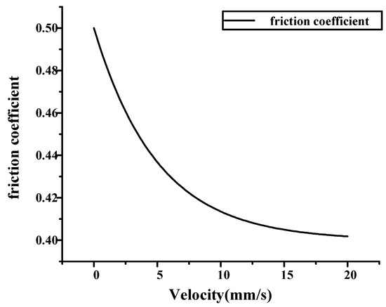 where is the dynamic friction coefficient; is the static friction coefficient; d is the attenuation coefficient; and is the equivalent slip velocity. To verify the load characteristics under high friction coefficient, is set to 0.4, is set to 0.5, and d is set to 0.2. An exponential decay model of the friction coefficient with relative sliding velocity is thus obtained, as shown in Figure 27.