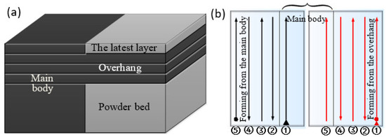 The T-shape overhang, laser scanning strategy, and forming directions are shown in Figure 1. The overhang was built using three layers. The length and width of the overhang were 0.48 and 1.1 mm, respectively, as shown in Figure 1a. The laser scans the latest layer from the overhang side in a simulation and scans from the main body side in another simulation, are shown in Figure 1b. The starting points of laser processing are marked with inverted triangles in both simulations. Every track is numbered according to the scanning sequence, as shown in Figure 1b.