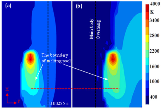 The temperature distribution on the X-Y plane (Z = 0, the top surface of the overhang) at 0.00225 s. (a) Forming from the main body; (b) Forming from the overhang.