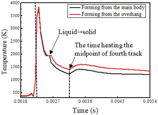 Before the heat source reached these points, their temperatures were close to ambient temperature; when the heat source was radiating the points, the temperatures increased rapidly and the peak values appeared behind the heat source. When heat source moved away, the temperature dropped rapidly. The estimated heating rate in Figure 3 is much larger than cooling rate, indicating that the heating processes are much faster than the cooling processes, which was also described in [29]. Especially, the cooling rates decreased rapidly when the melting pools were cooled to 1923 K due to the effect of the latent heat of solidification. The solidification processes continued until the temperatures dropped below 1873 K and then the temperature dropped sharply again. The effect of latent heat fusion is not enough to be noticeable due to the high heating rates. It is worth noting that, when forming the overhang and the temperature was below 1873 K, the temperature was higher and the cooling rate was lower than the temperature when forming the main body. When the midpoints of both track 4s are being heated, the temperatures increased slightly and then dropped slowly. The maximum temperatures and the lifetime of the melting pool were different in both simulations and the differences are further revealed in Figure 4 and Figure 5.