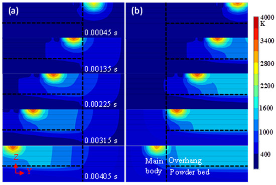 The transient temperature distribution on the Y-Z plane (X = 0.495 mm, the middle of the overhang in the X-direction) at 0.00045, 0.00135, 0.00225, 0.00315, and 0.00405 s, respectively. (a) Forming from the main body; (b) Forming from the overhang.