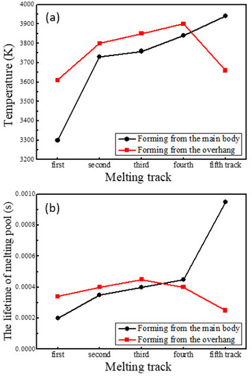 Due to the small contact area between particles, the thermal conductivity of powder can be supposed to be 1% of the solid thermal conductivity [27,32]. In addition, the unsupported overhang is not fixed to the substrate in the model, leading to a lower cooling rate than the main body. Thus, the overhang will maintain a higher temperature than the main body as the process parameters are the same, as shown in Figure 2 and Figure 3, which is equivalent to preheating with a higher temperature for the scanning of the next track. When the heat source moves away from the main body, the cooling rate decreases and such a preheating effect enhances, and vice versa, as shown in Figure 2, Figure 3 and Figure 4. Additionally, at the same cooling rate, the preheating effect of the latest scanned track can increase the temperature of melting pool in the scanning track, resulting in further enhancements of the preheating effect on the next track. As a result, when forming on the main body, the temperature and the lifetime of the melting pool at the midpoints of the tracks increase with the increasing number of tracks; when forming from another side, the temperature and the lifetime increase initially and the decrease, as shown in Figure 4 and Figure 5.