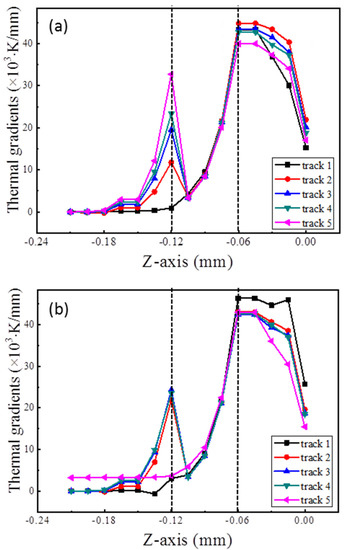 The distribution of thermal gradients in the Z-axis (X = 0.495 mm, Y = 0 mm, 0.12 mm, 0.24 mm, 0.36 mm and 0.48 mm, respectively, from track 1 to track 5 in both simulations). (a) Forming from the main body; (b) Forming from the overhang.