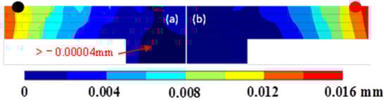 In both simulations, the displacement in the building direction was greater than 0.0122 mm, less than 0.0068 mm in the longitudinal direction, and less than 0.0061 mm in the transverse direction. The displacement distribution in the building direction is plotted in Figure 7.