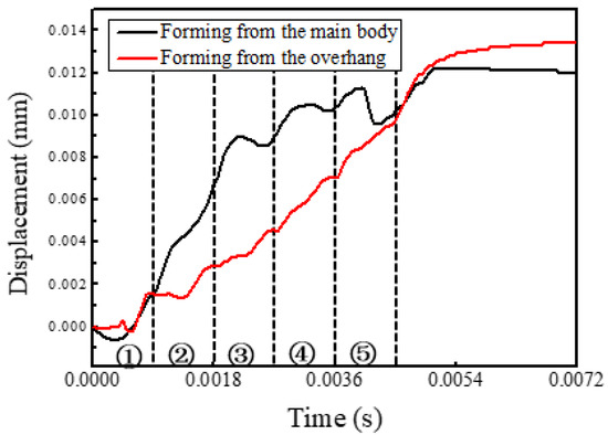 To characterize the process of the distortion, the measurement points indicated by the black dot and red dot in Figure 7 were created at the midpoints of both track 5s. The displacement variations of both dots in the building direction are presented in Figure 8. The closer the heat source was to the measurement points, the more obvious both of the upward and downward displacements will be; when the heat source is far from the measurement points, only the upward displacement is obvious. During forming of the main body, the displacement increased rapidly at first and then leveled off on the whole. In another case, the displacement increased linearly in general and overtook the former case eventually.