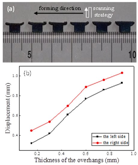 The deformed T-shape overhangs were photographed with a stereo microscope at 50 times, and then the true displacements were calculated using the ratio of the scale to the measured size. The as-fabricated T-shape overhangs, the laser scanning strategy, and the forming direction on the working plane are shown in Figure 9a and the maximum displacements of the overhangs in the building direction are shown in Figure 9b. It can be seen that the distortion of the right overhang is greater than that of the left one in a particular part, and the distortion increases with the thickness increasing.