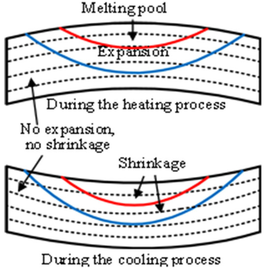 Due to the rapid heating of the heat source on the latest layer, a melting pool develops and the material below the melting pool is heated and expands. The region near the melting pool, which has a higher temperature, has more expansion. The expansion exerts a downward component force and an outward component force on the surrounding material. When the material yield stress, which is lowered due to the elevated temperature, is reached, a counter bending away from the melting pool will be perceived. During the cooling process, the heat source has left and the temperature drops rapidly. The melting pool solidifies and then shrinks and the material below the melting pool also shrinks. The more the temperature drops, the more obvious the shrinkage trend becomes. The shrinkage exerts an upward component force and an inward component force. Finally, the upper layers become shorter than the bottom layers due to the presence of the melting pool, which was verified by the simulations and the experiment, as shown in Figure 7, Figure 8 and Figure 9.