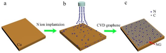 Diagram of N-doped graphene synthesis process: (a) polycrystalline Cu foils after cleaning; (b) pre-implantation of N ions in Cu substrates; (c) NG deposition on Cu surface.