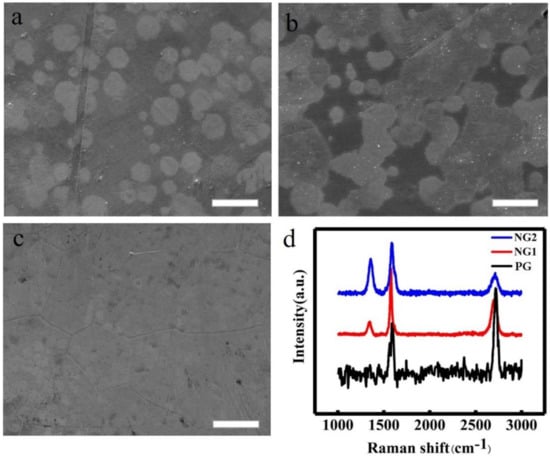 (a–c) SEM of fresh-prepared NG1-coated Cu in growth times of (a) 5, (b) 10, and (c) 20 min, respectively. Scale bar is 10 μm. (d) Raman spectra of fresh-prepared PG-, NG1-, and NG2-coated Cu.