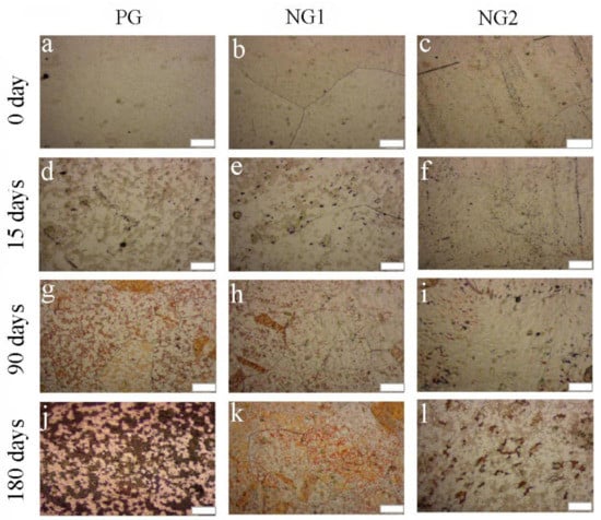 OM of the samples after exposure in air. (a–c) OM of PG-, NG1-, and NG2-covered Cu freshly prepared, respectively; (d–f) OM of PG-, NG1-, and NG2-coated Cu left in the ambient for 15 days, respectively; (g–i) OM of PG-, NG1-, and NG2-coated Cu left in the ambient for 90 days, respectively; (j–l) OM of PG-, NG1-, and NG2-coated Cu left in the ambient for 180 days, respectively. Scalebar is 20 μm. These photos were taken under uniform exposure conditions.