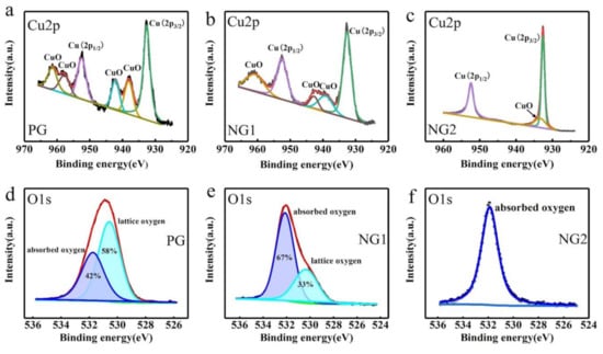To further determine the degree of oxidation of Cu, we performed XPS tests on the PG-, NG1-, and NG2-coated Cu exposed to air for 90 days. Characteristic peaks of Cu 2p2/3 and Cu 2p1/2 at binding energies of 932.6 and 952.5 eV can be observed in the three spectra (Figure 5a–c), respectively. It can be clearly seen from Figure 5a–c that the peak widths of these two peaks decreased, which indicates that the oxidation degree of Cu also decreased. The existence of CuO can be proved by two small satellite peaks next to each main peak, respectively, at binding energies of 961.5, 957.9, 942.6, and 938.1 eV [11,12] (Figure 5a). The high intensity of the four small satellite peaks proves the serious corrosion of PG-coated Cu. In Figure 5b, there are three satellite peaks with relatively low intensities at 961.1, 942.8, and 939.6 binding energies, proving that there was relatively less CuO in NG1-coated Cu. In Figure 5c, there is only a tiny satellite peak at a binding energy of 933.5 eV, proving that CuO was extremely rare in NG2-coated Cu. Characteristic peaks of absorbed oxygen (O2− ion or O− ion formed by the adsorption of oxygen molecules in the gas phase on the surface of metal oxides by chemisorption) at a binding energy of 530.6 eV [19,33] can be observed in the three patterns (Figure 5d–f). We know that the ratio of the peak area reflects the ratio of the bonding structure. The area of oxygen in the lattice (bonded to the metal) reached up to 58% in Figure 5a, indicating that PG-covered Cu was heavily oxidized. With the addition of N atoms, the area of lattice oxygen began to decrease from 33% (NG1) to nearly 0% (NG2), as seen in Figure 5e,f, which means that the degree of oxidation of Cu decreased. We cannot see the peak of lattice oxygen in NG2-coated Cu (Figure 5f), probably because the lattice oxygen is too weak to cause a change in the binding energy of the inner shell, and the spectral lines do not shift. These data indicate that after 90 days of exposure, PG-covered Cu severely oxidized, NG1-covered Cu also partially oxidized, and NG2-covered Cu only slightly oxidized to a low degree.