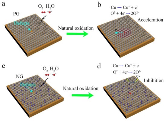 (a,b) Diagram of galvanic corrosion mechanism of copper by PG in long-term; (c,d) diagram of protection mechanism of copper by N-doped graphene in long-term.