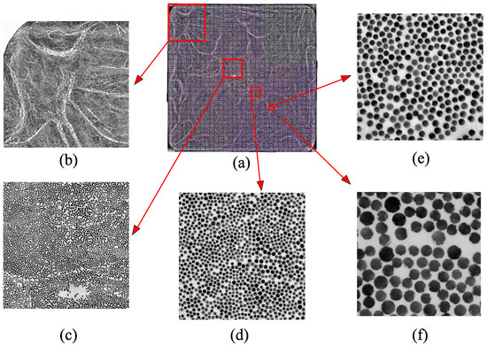 One of the analyzed cross sections (a) with examples of different RVE sizes for 4 × 4 patches (Case A), (b) 8 × 8 patches (Case B), (c) 16 × 16 patches (Case C), (d) 32 × 32 patches (Case D) (e) and 64 × 64 patches (Case E) (f). The grid used in (a) reflects 32 × 32 patches.