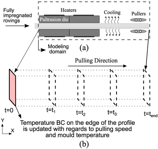 A 2D Lagrangian modeling framework was used to solve the coupled thermo– chemical– mechanical problem in the present study. In this modeling approach, a 2D material frame, representing a cross-section of the profile, moves along the pulling direction starting from the die entrance until the profile is cooled down. Similar to [10], the heat transfer in the fiber direction was neglected. This simplified 2D model allows using a fine mesh discretization, as it yields a fast computation time. This is essential to implement the variability with a high resolution throughout the cross-section, which is why this approach was chosen. A schematic representation of the modeling framework can be seen in Figure 3.