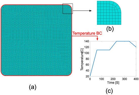 A set of subroutines were used to implement the material behavior into the process model. The elastic modulus evolution was defined in UMAT. USDFLD was used to import the distribution into the ABAQUS model. UEXPAN was used to define the dependent coefficient of thermal expansion and cure shrinkage. The heat generation through exothermic cure reaction depending on was included via HETVAL. dependent specific heat capacity, thermal conductivity, and density were defined in the user interface in the form of tabular data in which the was taken as a field variable. In total, 4080 elements were used in the model, which corresponds to approximately elements through the cross-section. The mesh structure used in this study can be seen in Figure 4. The total number of elements was same for each RVE size case, i.e., the mesh density was same for each model. The element type was set to ‘8-node generalized plane strain thermally coupled quadrilateral, biquadratic displacement, bilinear temperature, hybrid, linear pressure, reduced integration’ (CPEG8RHT).