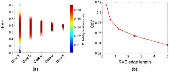 (a) values distribution, and (b) coefficient of variation with respect to the RVE edge length.