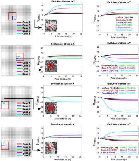 The first two rows in Figure 9 show the stress evolution within the RVEs located in the core region. At the core, process-induced stresses are supposed to be in tension. The of the first RVE was for ‘Case E’ due to a local resin pocket, as shown in the corresponding micro-graph. The of the second RVE was for ‘Case E’, which is a highly packed RVE. For the uniform case, integration points in both RVEs had similar stress in both directions, which were around MPa. Stress evolution in the RVE with the lower shows that the predicted stress value increases with decreasing patch size. Still, there were exceptions such as ‘Case A’ and ‘Case B’. The predicted stress value for the former case was higher than the latter despite the larger RVE size. This can be explained with the estimated values of these RVEs.