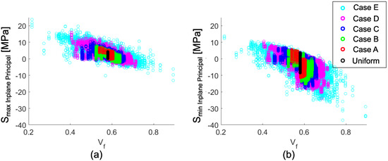 The predicted in-plane principal stress values are shown in scatter plots for each case in Figure 10 to reveal the correlation between and the predicted values throughout the cross-section. The general trends in stress distribution with respect to are similar for each case. However, a broader range of values for smaller RVE sizes results in higher stress values. The limit values for ‘Case E’ were around 24 MPa and −38 MPa, which corresponded to and fiber contents, respectively. The measured transverse tensile strength for glass fiber-reinforced polyester pultruded profiles are at a level of 50 MPa, and the compressive strength values are at a level of 70 MPa in the literature [50,51]. The predicted values are near critical levels. Therefore, the residual stresses should be taken into account when evaluating the performance of pultruded profiles. Moreover, here we have a location dependent gradient instead of a random distribution, which would play an essential role in the critical locations depends on the loading scenario.