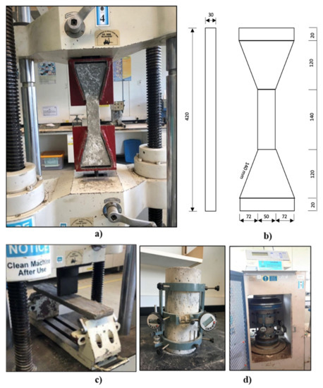 The direct tensile strength was carried out on dog-boned-shaped samples using a uniaxial tensile testing machine (GOTECH, Taichung City, Taiwan), as shown in Figure 2a,b, in accordance with the requirements and recommendations of Rokugo [32]. A total of 3 specimens for each mix was prepared and tested at 28 days of curing. The gauge length of the specimens was 80 mm and loading were applied at a controlled displacement rate of 0.005 mm/s. The load and displacement values were measured using a longitudinal potential displacement transducer (LPDT, GOTECH, Taichung City, Taiwan) that was built into the machine and the measurements were captured using a computer data recording system (U60 v6.1 Software, Gotech Testing Machines Inc, Taichung City, Taiwan).