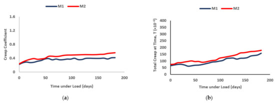 The creep measurement for the ECC mixtures were reported in two forms, total creep strain and creep coefficients, as shown in Figure 4. Both ECC mixtures show an increase in creep strain and creep coefficient over time. The rate of increase was higher in the early stages and gradually followed a steady incline throughout the rest of the testing period. This was bound to happen, as during the early stages of concrete, the compressive strength of concrete is very low, and thus, deformation could occur a great deal easier when loading is applied. In addition, as time continues, the hydration of cement takes place, which, in turn, results in the ECC gaining strength, which also, in turn, increases the elastic modulus and consequently reduces deformation under the long duration of applied loading. The addition of nano-silica decreased the overall creep strain and creep coefficient for both ECC mixtures. When comparisons were made, the total creep of M2 to M1 showed higher percentages, by 17.64, 68.6, 22.24% at the 7th, 30th and 90th days, respectively. The creep coefficient, on the other hand, for M1, ranged from 0.225 to 0.415, whereas, for M2, it ranged from 0.234 to 0.555. It is noticeable that there was a slight difference between the creep coefficient ranges between M1 and M2, and this was attributed to the fact that, when crumb rubber was added (lower stiffness compared to fine aggregates), it lowered the overall creep of the ECC. M1 and M2 had equal amounts of crumb rubber added into the mixture, hence, justifying the similarities in terms of ranges for creep coefficients of M1 and M2.