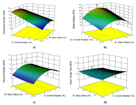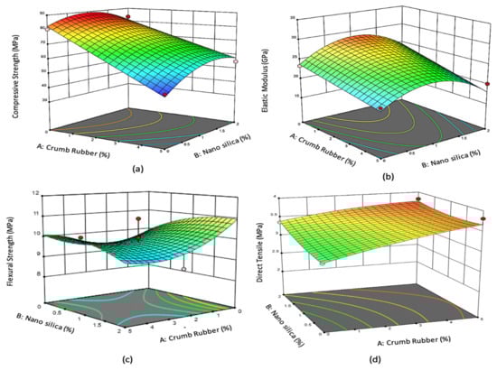 Figure 5, Figure 6, Figure 7 and Figure 8 show the 3D response surface plots for compressive strength, flexural strength, direct tensile strength, elastic modulus, Poisson’s ratio, and drying shrinkage of rubberized ECC. As shown in Figure 5, the compressive strength, flexural strength, direct tensile strength, and elastic modulus of the rubberized ECC decreases with increasing crumb rubber content. This reduction is attributed to the hydrophobic nature of crumb rubber, which repels water and entraps air on its surface leading to increasing air voids inside the hardened ECC cement matrix, which thickens and weaken the interfacial transition zone (ITZ) between the CR particles and the hardened cement matrix. However, adding nano-silica to the mixture leads to an increase in compressive strength, flexural strength, direct tensile strength, and elastic modulus of the rubberized ECC due to the pozzolanic reaction of nano-silica with surplus Ca(OH)2 from cement hydration and produces more calcium-silicate-hydrate (C–S–H) gel, resulting in increased strength through densification of the microstructure of the hardened cement matrix and also the ITZ. On the other hand, Figure 6 shows that the Poisson’s ratio decreases, and the drying shrinkage increases with increasing CR content. It also shows that the addition of nano-silica increases the Poisson’s ratio and decreases the drying shrinkage due to the reduction of the permeability because of the formation of secondary C–S–H from the high pozzolanic reaction of nano-silica. The formed C–S–H gel fills up the capillary pores in the rubberized ECC matrix and thus reduces drying shrinkage.