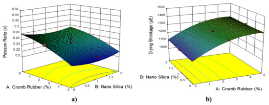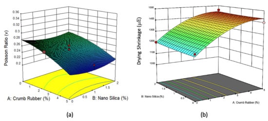The 3D response surface plot for 50% fly ash and 2% PVA fiber for (a) Poisson’s ratio and (b) drying shrinkage.