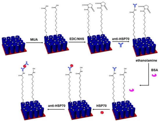 The AgNPs/TNTs was incubated overnight in 1 mM ethanolic solution of MUA. The sample was then rinsed with ethanol and distilled water and activated in a solution containing 0.4 M EDC and 0.1 M NHS (1:1) for one hour. Next, the electrode was washed with water, and 5 µL of 1 µg/mL anti-HSP70 solution in PBS was pipetted onto the surface. The immobilization of antibodies lasted one hour. One-hour surface inactivation was carried out with a 1M solution of ethanolamine in 1M HCl (pH = 8.5). The effectiveness of inactivation was verified by dropping and incubating the BSA solution on the AgNPs/TNTs surface. The detection of HSP70 was performed by placing different concentrations of HSP70 in the range from 0.1 to 100 ng/mL on the biosensor surface for 1 h. Finally, anti-HSP70 was re-pipetted onto the surface to confirm the antibody-antigen complex formation similar to the sandwich test. After each protein immobilization step, the electrode was rinsed with a PBS solution to remove physically adsorbed elements. The scheme of the biosensor functionalization is presented in Figure 1.