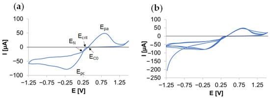Cyclic voltammogram measured in 1 mM AgNO3 solution at a scan rate of 50 mV/s of a three-electrode system using annealed TNTs as the working electrode, silver chloride electrode (EAg/AgCl (3 M KCl) = 0.222 V vs. SHE) as the reference electrode, and Pt mesh as the auxiliary electrode (a) and three subsequent CV cycles (b).