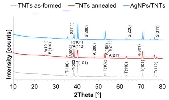 XRD diffractograms with the description of the peaks corresponding to the crystallographic planes for as-formed TNTs, annealed TNTs, and AgNPs/TNTs platforms are shown in Figure 4. XRD diffractograms of the TNTs as-formed sample showed the presence of peaks originating from the titanium substrate. Additionally, a slight background elevation at approx. 22° indicates the presence of amorphous TiO2 [67]. Amorphous materials scatter X-rays, which are manifested by broad humps on the diffraction patterns. In the case of the annealed platform, the presence of peaks originating from two crystal phases of TiO2, anatase and rutile, was also noted. The amount of anatase () in the structure of annealed TNTs was calculated from the Spurr and Myers equation [68]:
