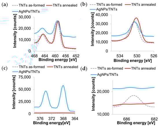 The summary of XPS spectra of titanium Ti 2p, oxygen O 1s, silver Ag 3d, and fluorine F 1s for as-formed TNTs, annealed TNTs, and AgNPs/TNTs are shown in Figure 5. Carbon, oxygen, and titanium were detected in all samples, as well as fluorine in as-formed TNTs and silver in the composite. The peak maximum for F 1s is observed at 684.2 eV. As it is present only in the as-formed structure, it can be stated that it exists in the form of F- ions physically adsorbed to TNTs [73]. The thermal treatment resulted in the removal of fluoride ions from the structure. The Ti 2p peaks reached a maximum at 458.6 and 464.3 eV with a doublet separation equal to 5.7 eV, which indicates the presence of Ti4+ in TiO2 oxide. Moreover, the slight changes in the spectrum at 457.9 eV indicate the presence of Ti3+ in Ti2O3 [74]. The O 1s oxygen spectra for all samples are similar to each other, and their asymmetry indicates the presence of more than one type of bond. The peak at ~530 eV is attributed to oxygen in titanium oxides (O2− in the crystal lattice) [75], while the distortion of the spectrum at higher binding energies corresponds to the OH− groups or adsorbed water at point defects (oxygen vacancies), or oxygen in carbon contamination, which is recognized on the surface of most samples exposed to air [74,75]. The Ag 3d spectrum for the AgNPs/TNTs composite shows a 3d doublet structure (the d5/2—d3/2 separation is 6.0 eV), which indicates the metallic state of silver [70]. The Ag 3d5/2 peak is negatively shifted in relation to the standard binding energy (368.4 eV) due to the fact that spherical nanoparticles have a greater number of non-coordinated surface atoms, which reduces their binding energy [76,77]. Additionally, Figure 5a,b indicate a shift of the peak maxima to higher binding energy for the AgNPs/TNTs sample, compared to as-formed and annealed TNTs, due to the strong interaction between Ag and TiO2, and indicates electron transfer between the structures [78,79,80]. According to the literature, this phenomenon results from the leveling of Fermi levels as a result of the contact of silver with TiO2 nanotubes [78,81]. Moreover, this can be interpreted as a partial reduction of Ti4+ on the surface, resulting from the formation of a metal-metal bond between Ag and Ti and a surface O-Ag bond. However, these shifts are not indicative of silver oxidation, which was also confirmed by XRD analysis [78,82].
