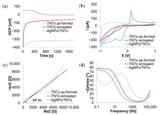 Open circuit potential measurements give information about the tendency of a material to corrode because its value indicates when corrosion may begin. Figure 6a demonstrates the stationary potential curves recorded during 30 min for as-formed TNTs, annealed TNTs, and AgNPs/TNTs composite. The OCP of all samples is relatively stabilized after about 500 s, proving the equilibrium between the dissolution of the oxide layer and the adsorption of ions on the tested surface. As-formed nanotubes are characterized by a negative value of the stationary potential, TNTs modifications increase OCP value and thus corrosion resistance [83]. The curve recorded for the AgNPs/TNTs shows mild oscillations, indicating that the processes taking place on the electrodes, i.e., the oxidation of silver on the surface, may result from the reaction of silver ions with chloride ions from PBS [49,84].